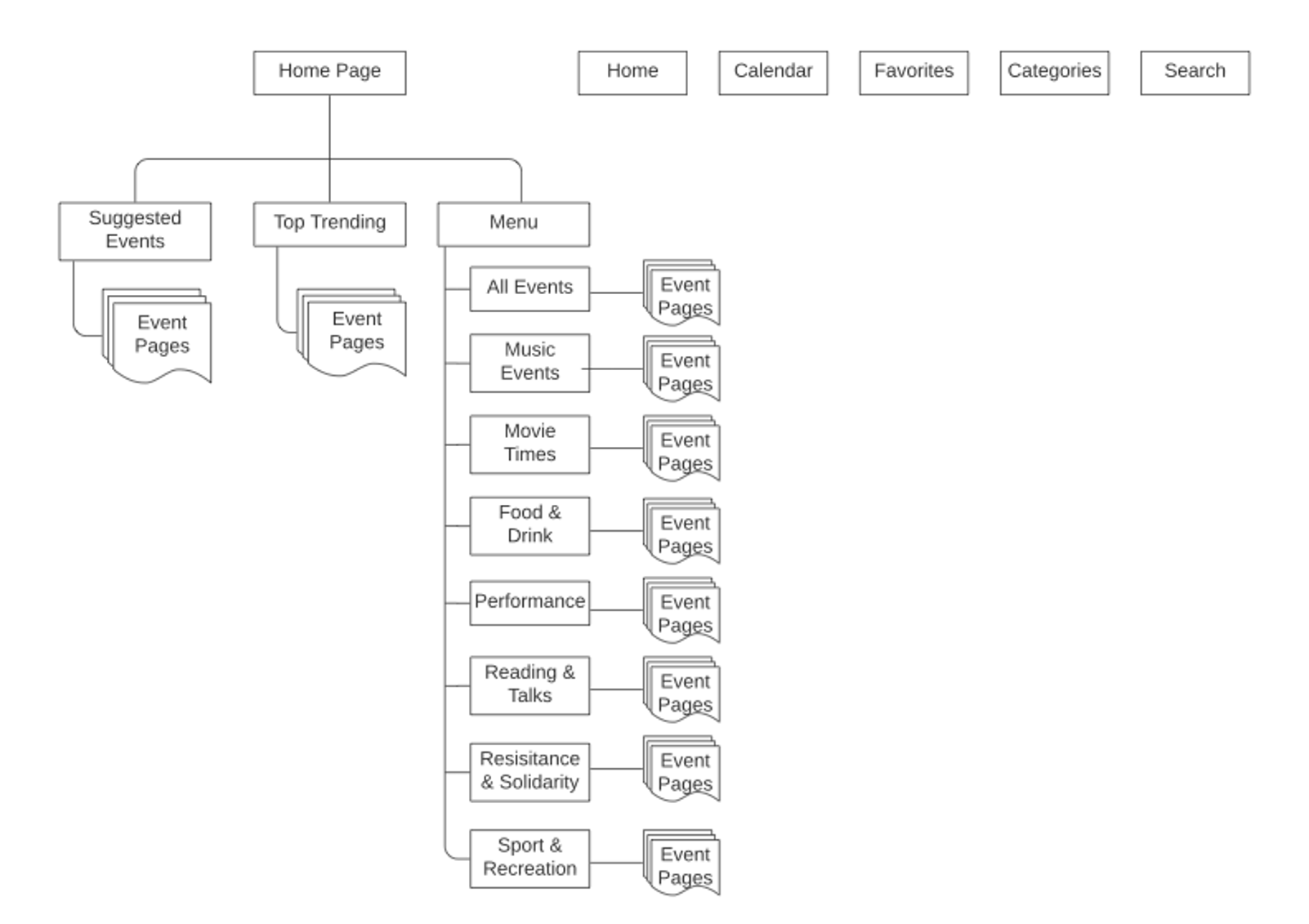 Previously, the only way a user could browse or find an event was to scroll to the bottom of the page—typically taking a good four swipes. With that, I initially brought the categories menu to the top right of the screen in an ellipsis, for immediate visibility.